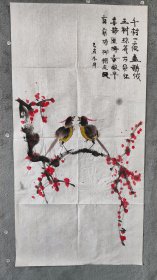 B40827号国画 写意花鸟双寿喜上眉梢 喜鹊登梅 68×34cm 作者:陕西省 西安市画家,千村一夜盖鹅绒, 玉树琼花万朵红。 喜鹊登梅春报早, 庭前杨柳探东风。