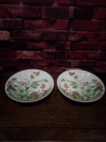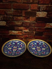 珐琅彩瓷器兰地釉蝴蝶花卉祝寿盘【一对】福在眼前 缠枝花卉 蝴蝶祝寿 如意纹花卉边 底有两条青釉龙纹 釉色肥厚 浆体环绕 满功花卉 细纹开片 高度43mm 直径215mm 一对重量750g