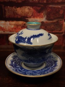 青花釉瓷器龙纹花卉盖碗 青花花卉 茶碗 盘龙 主人杯 三件套 套组 茶宠 海水纹 满功 釉色肥厚 浆体环绕 饰松石绿 细纹开片 满功 高度95mm 碗口径97mm 重量280g
