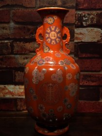 珐琅彩瓷器珊瑚红地釉花卉双耳赏瓶 团花花卉 祝寿 釉色肥厚 浆体环绕 满功花卉 细纹开片 饰松石绿 高度322mm 直径150mm 重量1839g 三斤六两