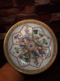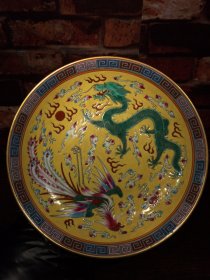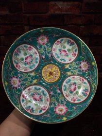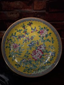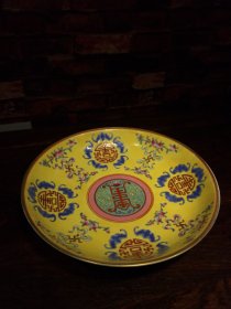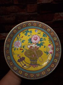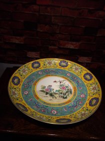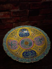 珐琅彩瓷器黄粉地釉花卉花边祝寿盘 福在眼前 祝寿 釉色肥厚 浆体环绕 满功花卉 饰松石绿 细纹开片 高度50mm 直径220mm 重量639g 一斤二两