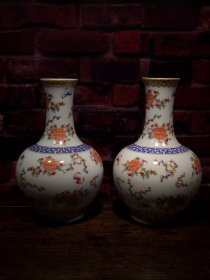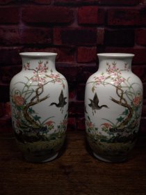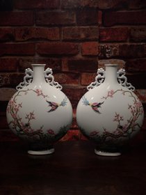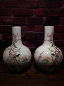 珐琅彩瓷器花鸟花卉题诗文天球瓶【一对】梅花花卉 牡丹 喜上眉梢 开片均衡自然 满功 釉色肥厚 浆体环绕 高度235mm 直径155mm 一对重量1980g 三斤九两