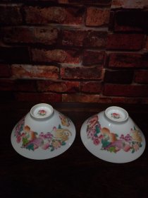珐琅彩瓷器三果花卉斗笠碗【一对】寿桃花卉 石榴 开口笑 花开富贵 开片均衡自然 斗笠状 满功 釉色肥厚 浆体环绕 高度69mm 直径155mm 一对重量380g