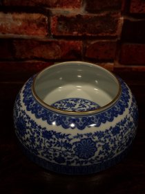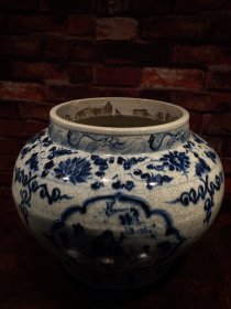青花釉瓷器古人物花卉文房大罐 青花釉 釉色肥厚 花卉 波斯纹 海水纹 开片均衡 缠枝花卉 浆体环绕 满功 满纹 大罐 高度262mm 直径338mm 重量5620g 十一斤二两
