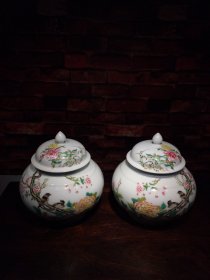 珐琅彩瓷器花鸟花卉题诗文罐【一对】花开富贵 做茶叶罐最合适 文房罐 题诗文 细纹开片 满功 釉色肥厚 浆体环绕 高度190mm 直径190mm 一对重量2890g 五斤七两