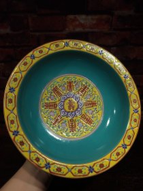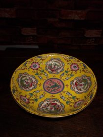 珐琅彩瓷器黄兰地釉八宝璃龙花卉祝寿碗 花开富贵 福在眼前 璃龙纹 八宝花卉 满功 釉色肥厚 浆体环绕 细纹开片 高度56mm 直径167mm 重量270g