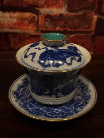 青花釉瓷器花卉盖碗 青花花卉 茶碗 麒麟 主人杯 三件套 套组 茶宠 海水纹 满功 釉色肥厚 浆体环绕 饰松石绿 细纹开片 满功 高度91mm 碗口径90mm 重量260g