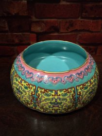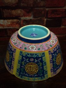 珐琅彩瓷器黄兰地釉花卉祝寿碗 大碗 兰地釉花卉 祝寿碗 福在眼前 釉色肥厚 浆体环绕 满功花卉 饰松石绿 细纹开片 高度119mm 直径228mm 重量1440g 二斤八两