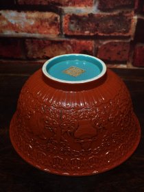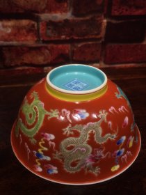 珐琅彩瓷器珊瑚红地釉龙纹花卉祝寿碗 花开富贵 福在眼前 彩釉龙纹 满功 釉色肥厚 浆体环绕 饰松石绿 细纹开片 高度71mm 直径151mm 重量239g