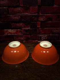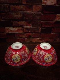 珐琅彩瓷器胭脂红地釉寿桃花卉碗 一对 福在眼前 寿桃 祝寿 缠枝花卉 釉色肥厚 浆体环绕 满功 细纹开片 高度70mm 直径152mm 重量420g