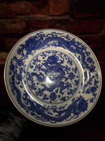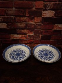 青花釉瓷器缠枝花卉盘【一对】青花釉 福在眼前 釉色肥厚 浆体环绕 如意纹花卉边 满功 饰松石绿 细纹开片 完美 高度43mm 直径210mm 一对重量880g