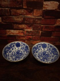 青花釉瓷器龙纹花卉碗【一对】缠枝花卉 碗内外青花龙纹 如意纹 一对 釉色肥厚 浆体环绕 满功 完美 高度67mm 直径167mm 一对重量539g