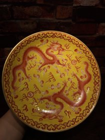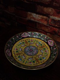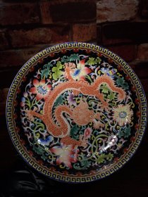 珐琅彩瓷器墨地釉矾红龙纹花卉盘 福在眼前 墨地釉花卉 回旋纹 矾红龙纹 满功花卉盘 釉色肥厚 浆体环绕 细纹开片 高度46mm 直径212mm 重量400g