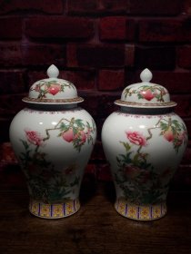 珐琅彩瓷器寿桃花卉题诗文将军罐【一对】寿桃花卉 题诗文 花开富贵 祝寿 开片均衡自然 满功 釉色肥厚 浆体环绕 高度238mm 直径146mm 一对重量1800g 三斤六两