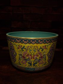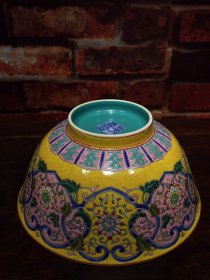 珐琅彩瓷器黄地釉如意花卉祝寿碗 花开富贵 福在眼前 粉釉如意花卉 满功 釉色肥厚 浆体环绕 饰松石绿 细纹开片 高度78mm 直径163mm 重量320g