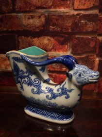 青花釉瓷器羊兽樽爵杯 青花麒麟纹 海水纹 塑形爵杯 釉色肥厚 浆体环绕 满功 饰松石绿 细纹开片 完美 高度109mm 长度148mm 重量290g