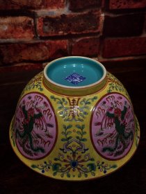 珐琅彩瓷器黄粉地釉开窗凤纹花卉祝寿碗 缠枝花卉 开窗粉地釉彩凤纹 祝寿碗 釉色肥厚 浆体环绕 满功花卉 细纹开片 饰松石绿 高度80mm 直径166mm 重量330g