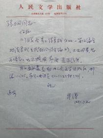 严辰致徐放毛笔信札1页无封。严辰,原名严汉民,笔名厂民,1914年生,江苏武进人。1933年毕业于上海正风文学院。曾任国立编译馆编审。1941年参加工作。历任延安文艺界抗敌协会、鲁迅艺术文学院研究室和中央党校四部创作员、教师,华北联合大学、华北大学文学系教师,中国作协专业作家,《人民文学》副主编,《新观察》主编,黑龙江省文联副主席,中国作协第二、三、四届理事及第五、六届名誉委员,《诗刊》主编、顾问