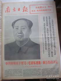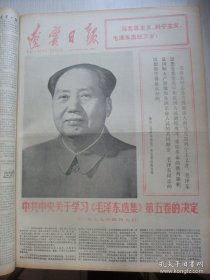 原版合订本:南方日报(1977年5月)馆藏品佳。毛主席巨幅标准像、华主席巨幅标准像、纪念毛主席主办农民讲习所51周年、记雷锋式的知青张建军、梵杨诗、陶世虎国画《喜看今朝旗更红》、华主席视察东北三省和唐山、杨干华散文《阳光雨露之歌》、陈小平诗、李昌松诗、沈尧伊油画《而今迈步从头越》、赤彩画·忠干定颐诗连环画《学大庆争上游》、毛主席纪念堂建筑工程完成等内容