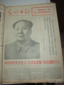 原版报合订本:光明日报(1977年4月)评两面派姚文元、大庆英雄谱李景荣、大庆英雄谱齐莉莉武丽云、高泉康东钱志林画作、苏高礼林岗庞涛画作、柳青画作、毛主席巨幅标准像、中共中央关于学习《毛泽东选集》的决定、全国各地庆祝《毛泽东选集》出版发行活动、张步宣传画《喜迎雄文》、全国工业学大庆会议、画刊《华主席和大庆心连心》、华主席视察大庆、华主席接见大庆干部和英雄模范代表、华主席学大庆题词手迹等内容
