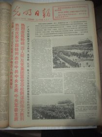 含粉碎四人帮专辑原版报合订本:光明日报(1976年10月)毛主席巨幅标准像、国庆二十七周年活动、查世铭版画、任柏林诗、关于建立毛主席纪念堂和出版毛泽东选集的决定、徐宁画作、李小雨诗、首都军民庆祝华国锋任党主席和粉粹四人帮、上海百万军民举行盛大庆祝大会、各省市自治区和各总部兵种各大军区庆祝盛况、各省市自治区和各总部兵种致电华主席党中央、李行简国画、宋家玲诗、树元诗、史志前诗等