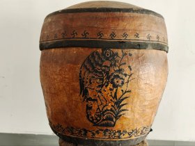 民俗老物件,剪纸工艺收纳盒,老报纸、墙纸装裱纸糊表面,正面剪纸工艺,民间老杂项收藏精品,怀旧老物件,可做摆设、空间点缀等使用, 尺寸:高34口径32厘米