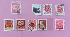 邮票1992年猴票20分等90年代生肖票9张合售(信销票、有重复)7-85品【鸡票(剪纸20分2张、剪纸50分1张),狗票(20分、50分各1张),猪票(20分、50分各1张),牛票50分1张】
