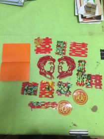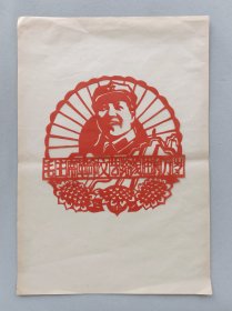 80年代毛主席肖像剪纸。红色剪纸/老剪纸/老刻纸/手工剪纸/手工刻纸。毛主席革命文艺路线胜利万岁,内容包含井冈山,向日葵,红太阳等。衬纸38×26.5,剪纸20×20厘米。