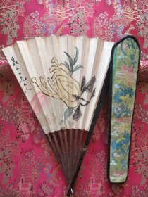 清代手绘寿桃佛手折扇(背部圣教序内容书法)一把+清代荷花牡丹真丝锦绣扇套一个合售~扇子是2面成扇,一面画一面字。寿桃佛手题材寓意好,书法刚劲有力!!!