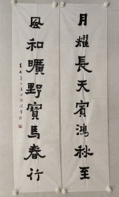 刘文超 行草对联 四尺整张 静对图书寻乐趣,闲看花鸟会天机(中间裁开,一裁为二,即成一幅对联)