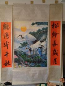 大幅祝寿印刷品 中堂《松龄鹤寿》(二旁对联一副 见图)【中堂尺寸:163×74】