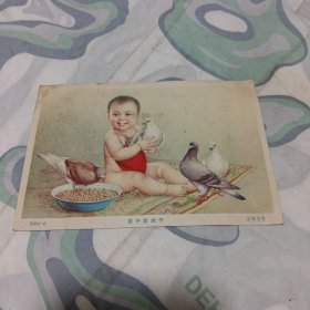1957年背面油印祝老师新年快乐金梅生作《孩子爱鸽子》彩色小画片
