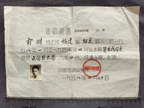 1958年中国医学科学院进修证书,学生俞渊系福建省邵武县人,复旦大学生物系昆虫专门化专业毕业,在中国医学科学院医学昆虫学进修——LJ662