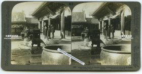 清末民国立体照片----清末八国联军占领北京后慈禧从紫禁城故宫出逃,留下看管慈禧寝宫院落三位太监宫人,屋宇已经破旧,廊子的尽头还挂有西洋仅供的钟表