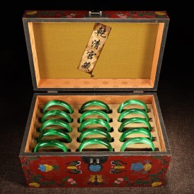 珍藏旧藏下乡收清代宫廷御藏极品罕见绿猫眼石手镯一盒 品相保存完好 一盒15支 配老漆器盒一个 盒长32厘米 高17厘米 宽20厘米 内径6.0厘米左右 平均一支重50克左右