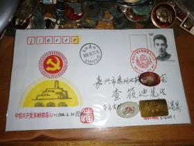 手绘封,嘉兴书画家、集邮名家潘澄清手绘,党徽、延安宝塔山,中国共产党早期领导人,2006.6.30,潘澄清手绘,贴中国共产党早期领导人彭湃80分邮票,潘澄清寄查筱迪手绘封