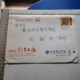 实寄封:余三定(湖南理工大学校长、教授、《云梦学刊》主编)致 刘纲纪(武汉大学教授、湖北省美学学会会长)贺卡一枚、含封