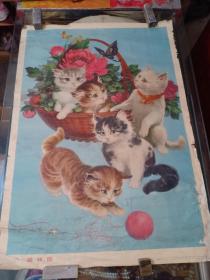 1983年宣传画 史延芹作《猫戏图》四只小猫玩耍,品一般,75.5*52.5cm