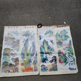 1983年宣传画或年画 黄山四景) .画配诗(四条屏 2开两张)每张尺寸76厘米 宽52厘米