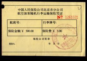 [BG-C6]航空类票证卡/保险/中国人民保险公司北京市分公司航空旅客随机行李运输保险凭证1021/保险金额500.00元保险费3.00元/背说明6条,12.8X8.2厘米。