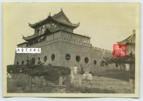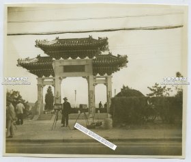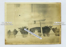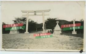 民国山东青岛贮水山北麓,日本占领青岛后改为若鹤山,日本所建青岛神社大门入口处老照片, 抗战胜利后,神社内的物品被中国百姓哄抢一空,1946年初被拆除。10.5X8厘米,泛银