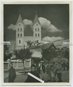 民国山东青岛市南区浙江路圣弥厄尔教堂前的街道、民居,以及青岛百姓老照片,圣弥厄尔是中国唯一的祝圣教堂,建国前山东省最高的建筑。教堂始建于1932年。11.9X9.9厘米
