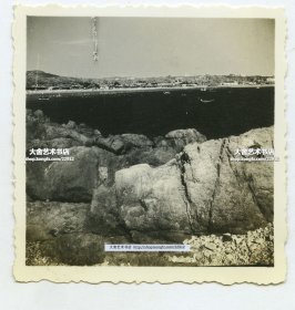 民国山东青岛海滩海滨,远眺对面山东青岛汇泉湾畔第一海水浴场全景老照片。6X6厘米。泛银