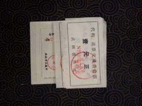 武钢接待处代购,送票交通费收据1元2张(8.5/5.1cm),2元一张(6.3/5cm)2元2张订购火车票,飞机票手续费(8/6cm)。5张一端粘连在一张纸上,共5张合售
