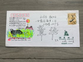 2002年著名央视春晚导演张子扬手绘封------2002年8月26日日喀则归来。销拉萨邮戳,载体是“拉萨饭店”公函封。题诗:金顶收留了无数个太阳/云在湖面上起舞/雅鲁藏布追随着朝圣者的经纶/牦牛悠然地在青稞田里走过/风是天神对冈底斯山的耳语。《朝圣者日记》