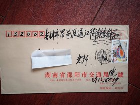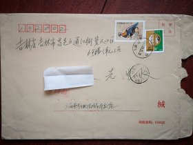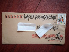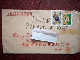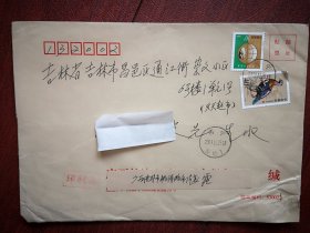 实寄封(邮简),贴普31中国鸟1元邮票,普30保护家园60分邮票各一枚,呼和浩特土默特左旗白庙子至吉林市通江街,2009年11月10日蒙文汉文对照邮戳。阜丰生物科技公司黄原胶厂