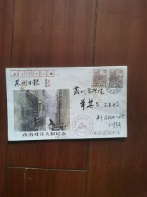 著名书画家一一江淳,毛笔手书签名寄赠《苏州日报》改出对开大报纪念实寄封。