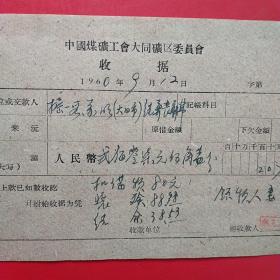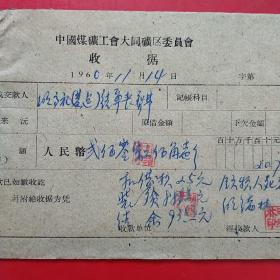 1960年9月14日,许乐,1960年5月大同白洞矿矿难去世684人之一,建国自来发生最大的矿难,赔偿费单据2张,阳高县人(12-4)(生日票据,大同煤矿,手写票据)