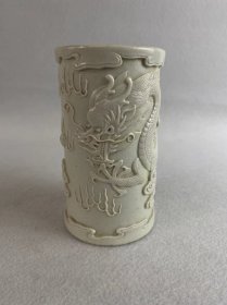 民国白釉雕瓷龙纹笔筒