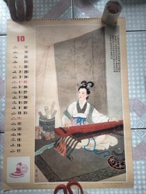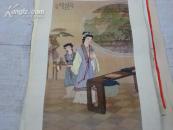 老挂历画工笔仕女1张 文姬抚琴图 任梦龙绘画瑕疵品 外围大致尺寸52 × 37 cm